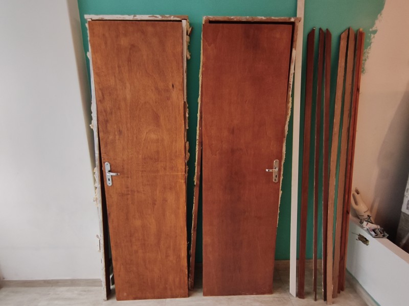 2 portas em madeira, completas com batentes, guarnição e fechadura com chaves.